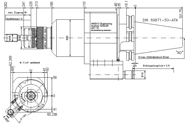 AWEKO-A.R.T. 12 zum rationellen Gewindeschneiden ohne maschinenseitigen Drehrichtungswechsel mit Spannzangenspindel Größe ER16-M zur Aufnahme von Gewindebohrer der Größen M6 - M10 Spannbereich von 1 - 10 mm. Winkelgewindebohrkopf A.R.T. 12